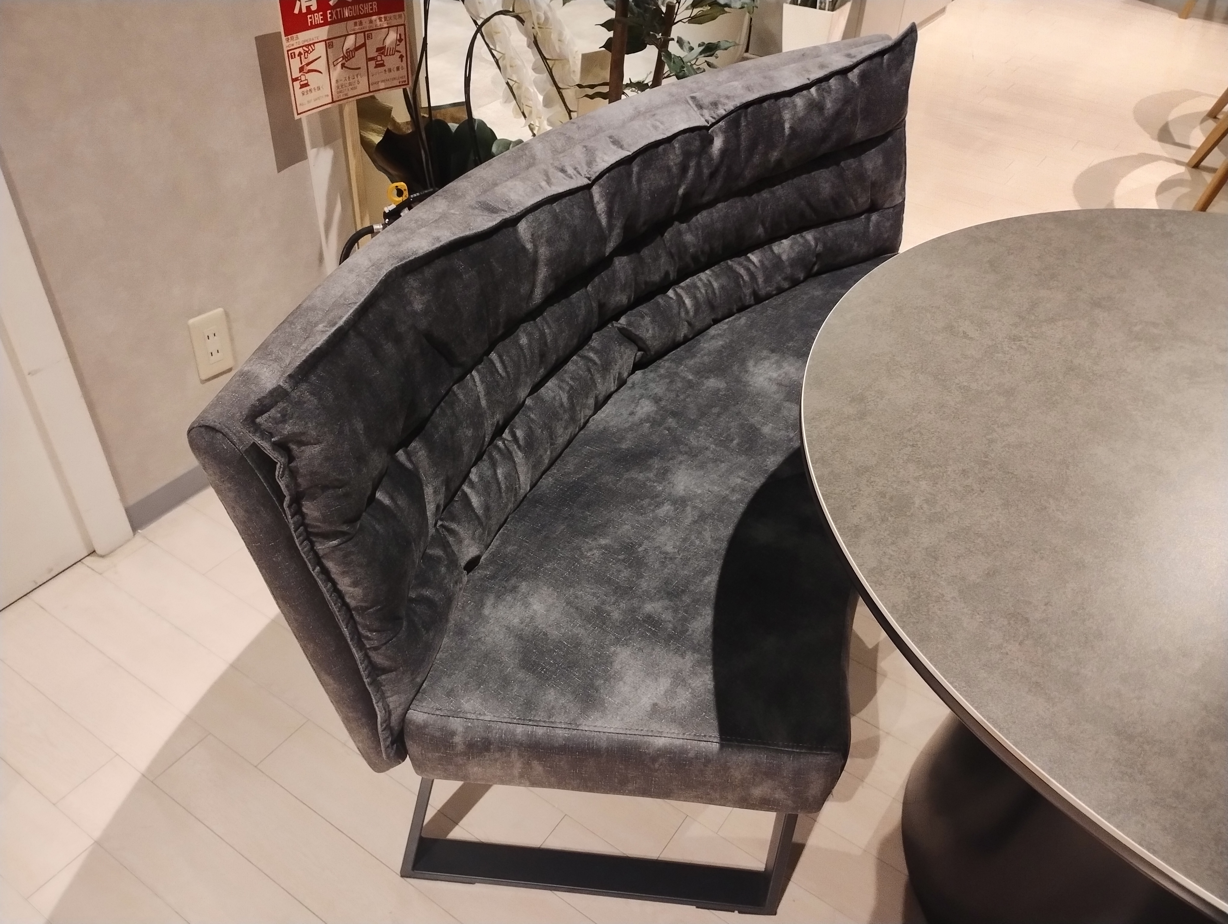 今流行りの円形テーブルに背付き・背無しベンチを合わせたダイニングセットです。どちらもバームクーヘンのような長いベンチになっていますので、座る人数が増えてもゆったり使用することができます♪