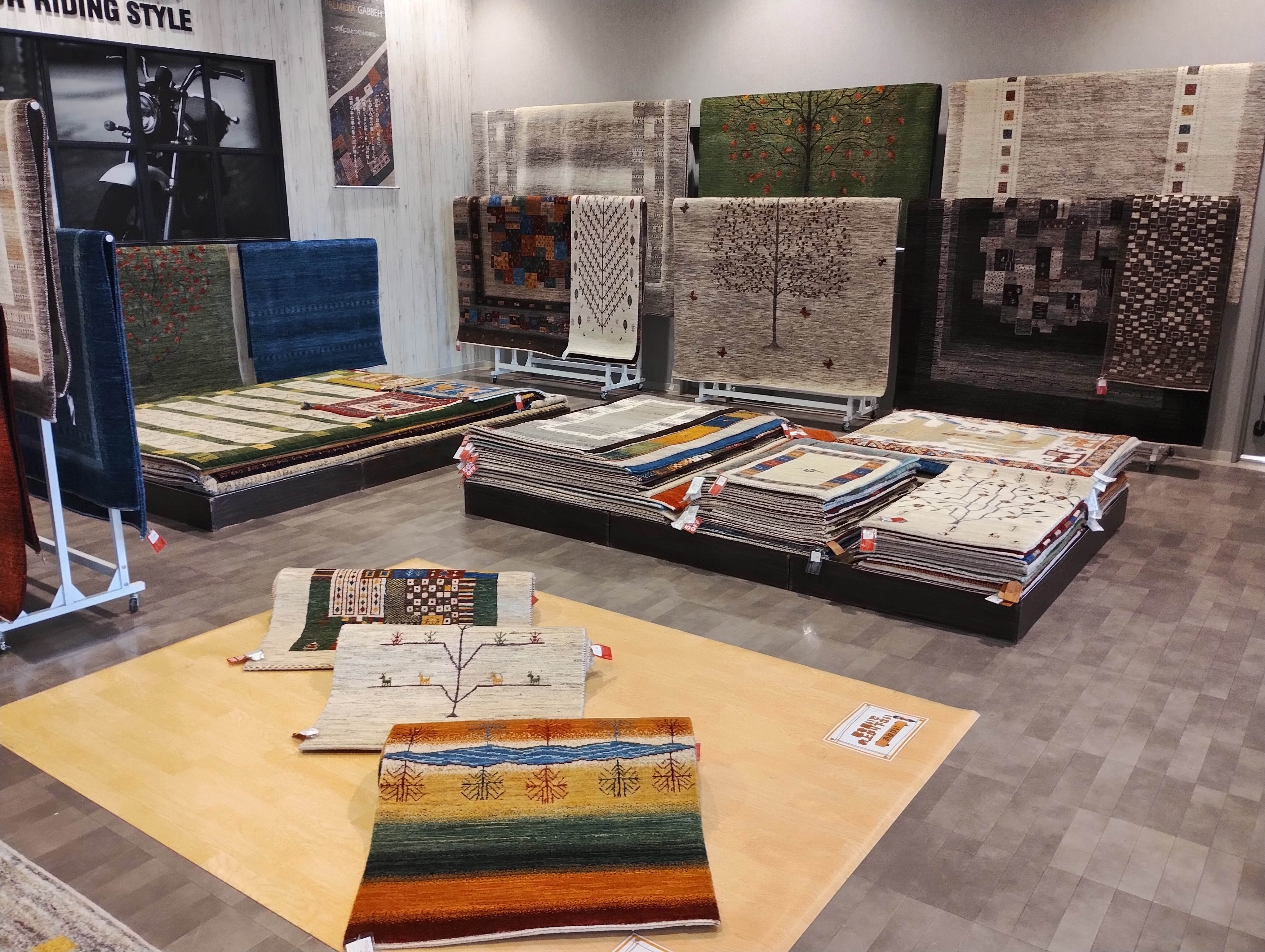 そして「プレミアムギャッベセール」では、世界に一枚しかない「世界最高峰」に触れていただけます!チェアパッドからソファの下に敷くような大判サイズまで多くの種類のプレミアムギャッベを展示しております♪