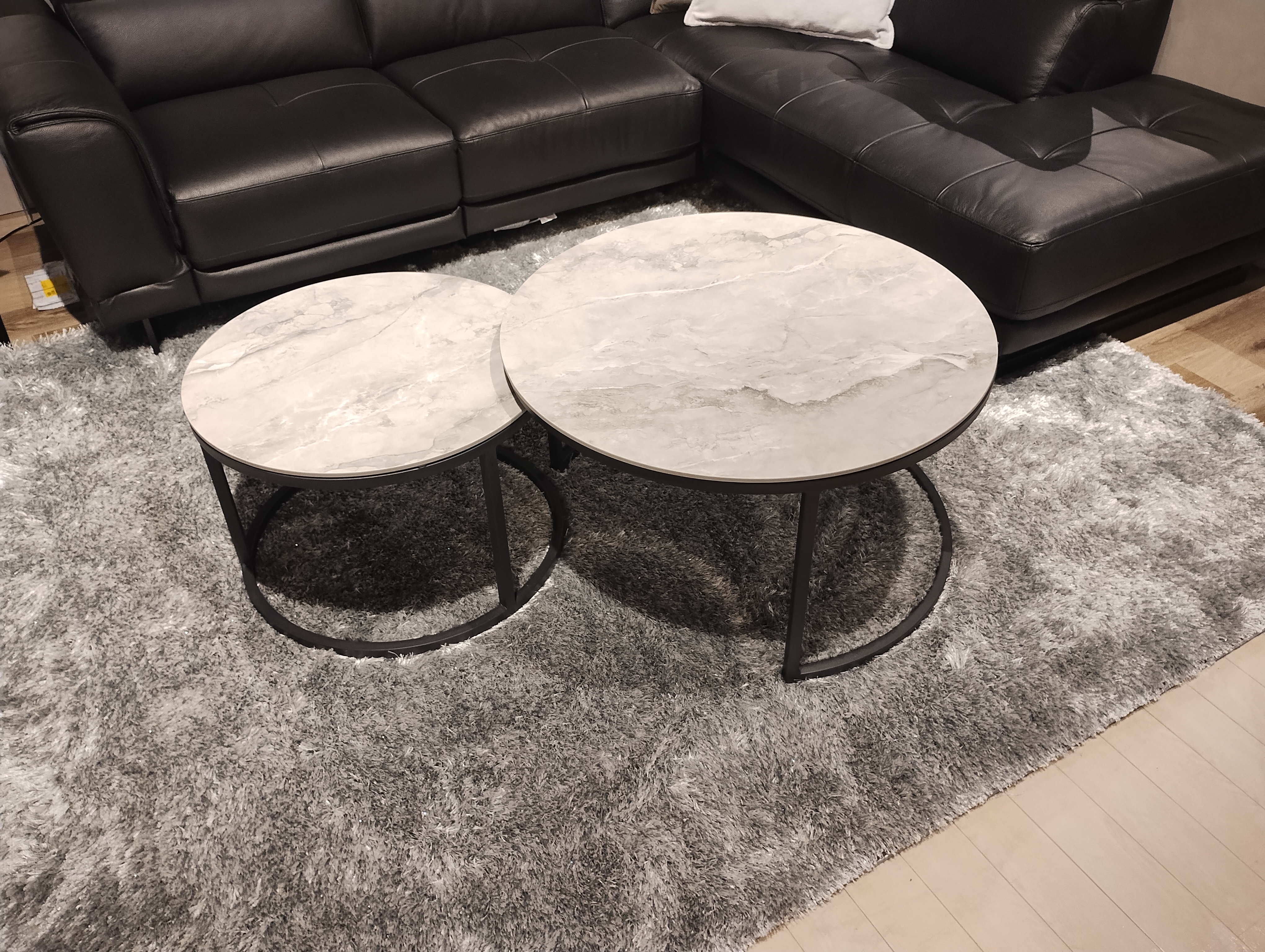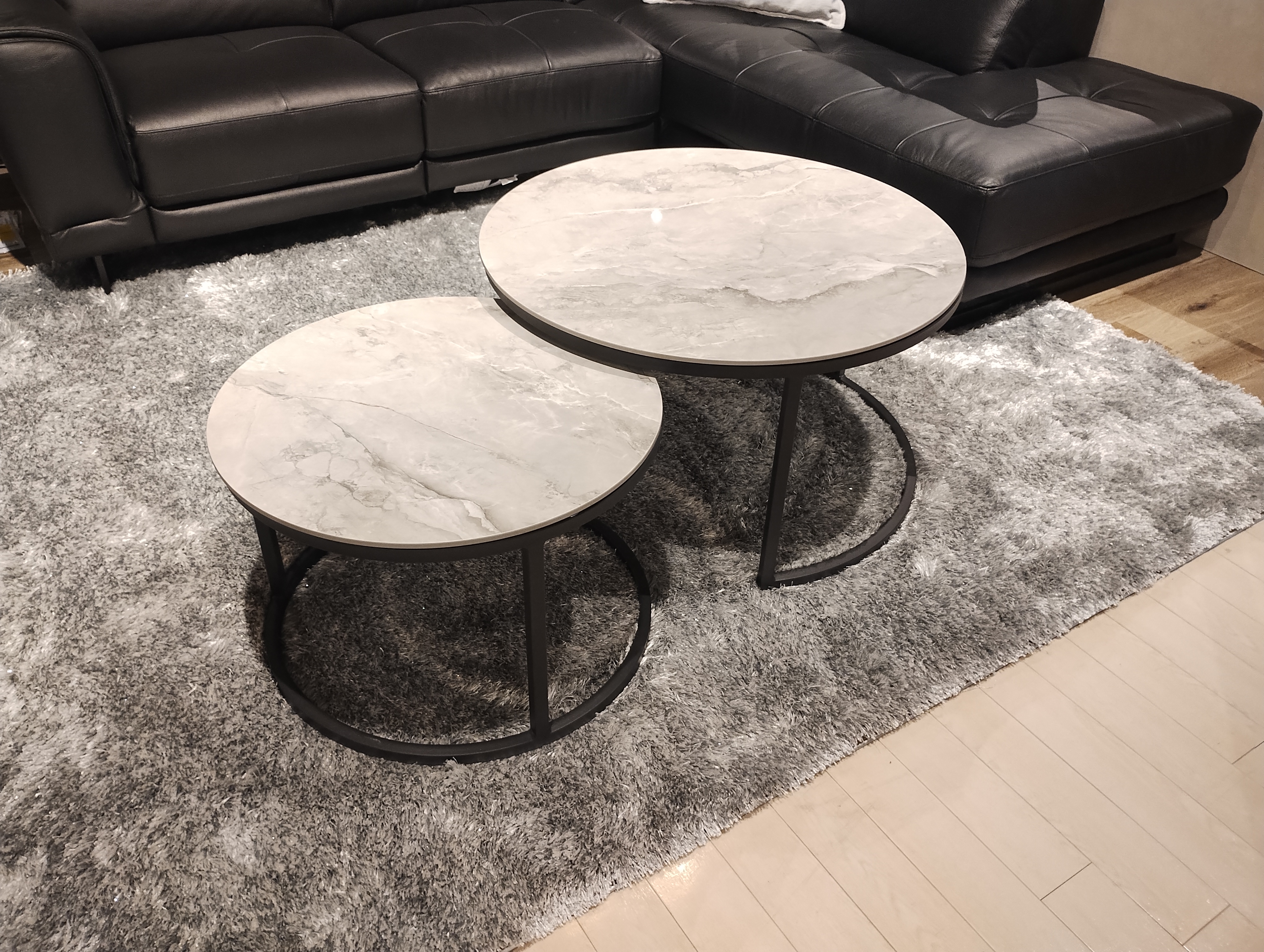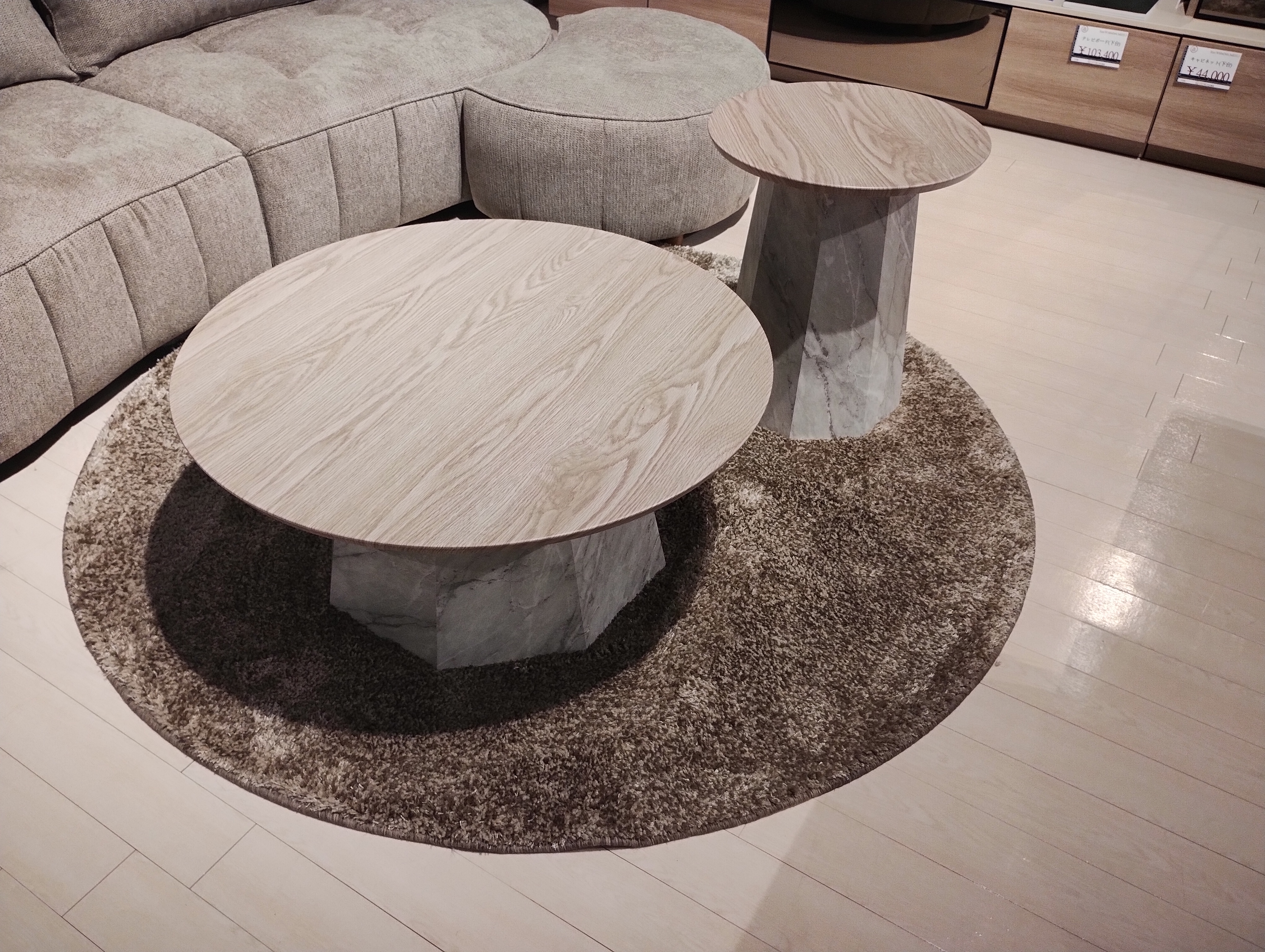 こちらのセンターテーブル、一見二つの円形テーブルが並んだように見えますが、じつはくっついているんです。小さなテーブルをクルクルと移動させることでレイアウトも変更可能です♪