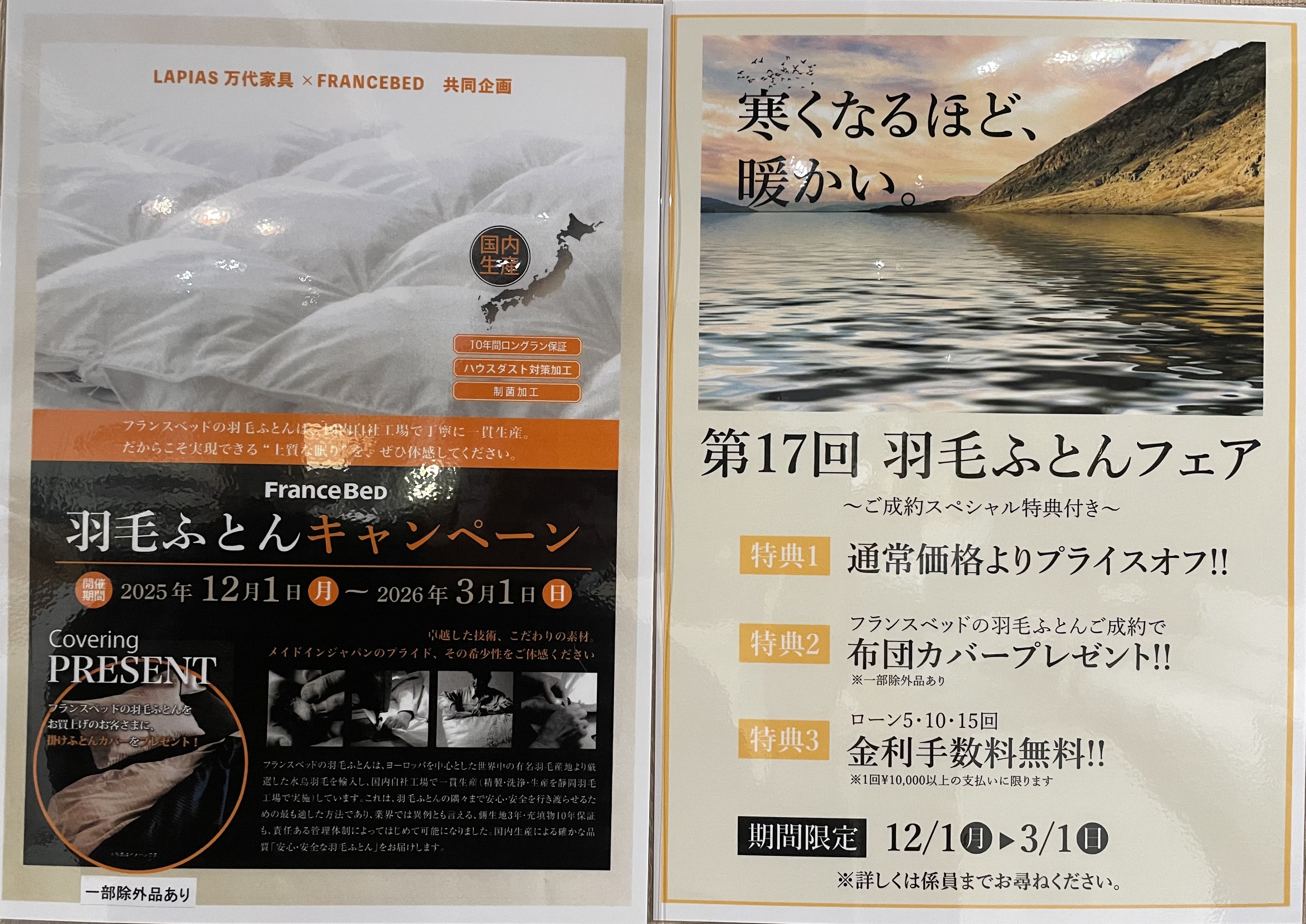 2025年12月1日~2026年3月1日までの期間限定でフランスベッド羽毛布団キャンペーンを開催中です!!