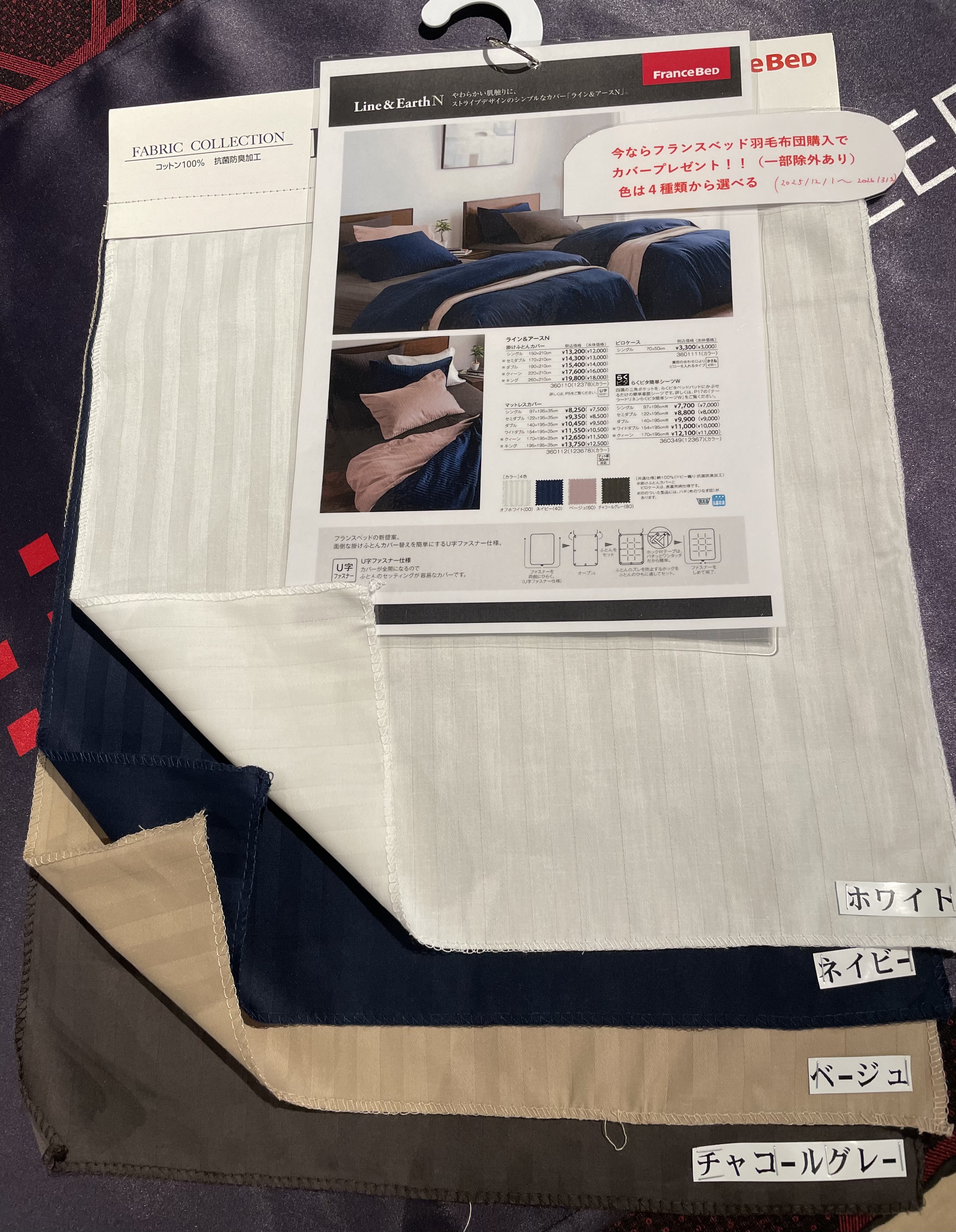 今ならフランスベッドの羽毛布団購入で写真にもある純正の綿100%布団カバーもプレゼントしています。(一部対象外商品もあります)