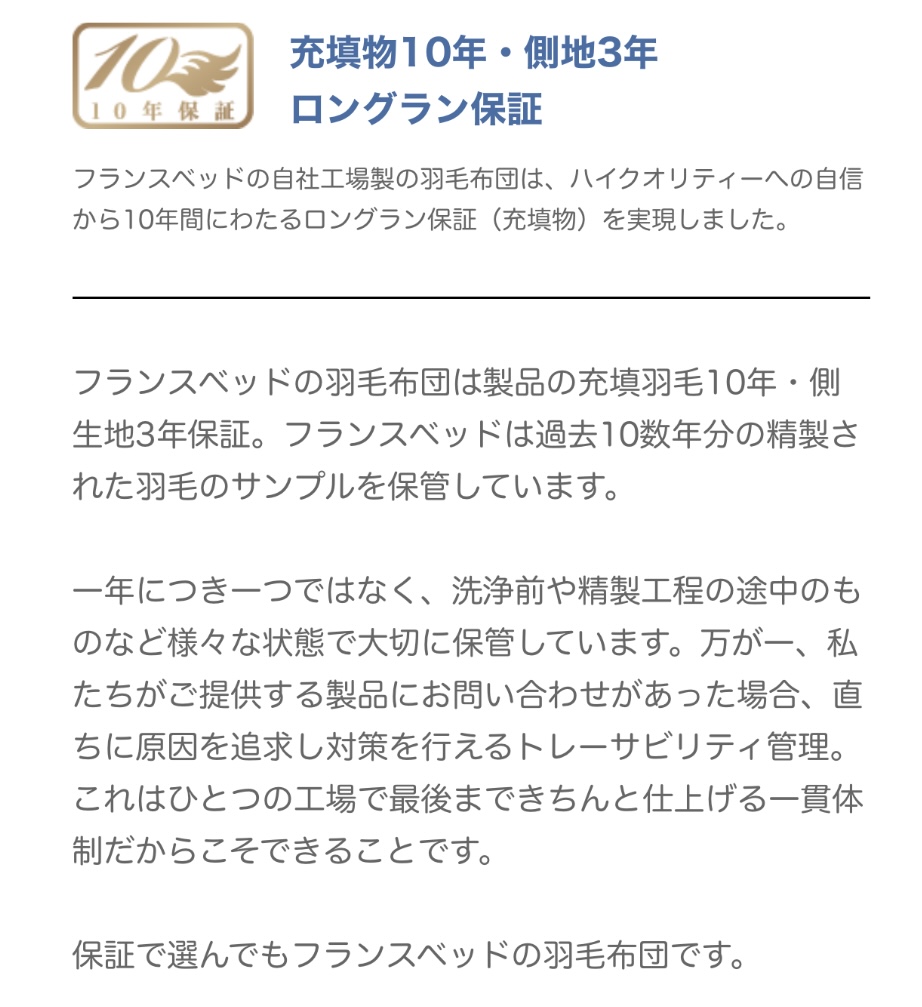 フランスベッド羽毛布団グッドポイント③<充填物・側地への安心の長期補償>