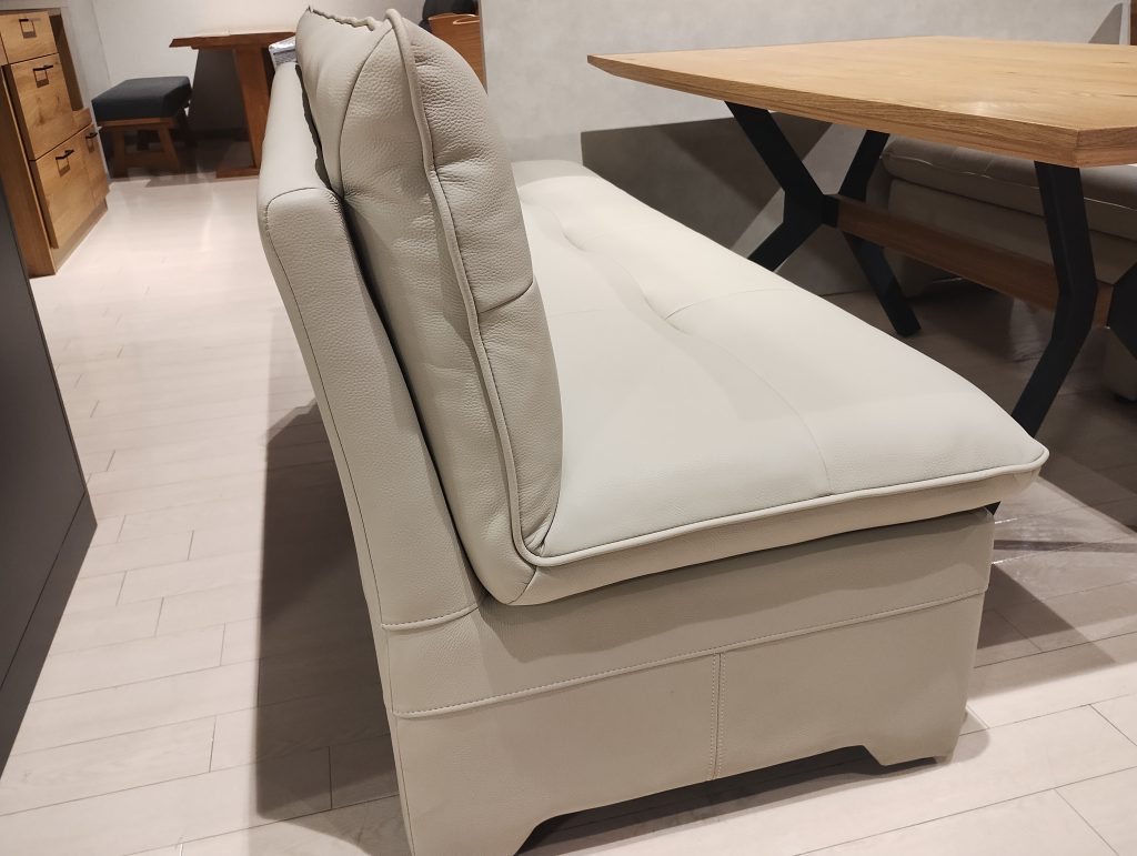 また、ベンチは通常のダイニングチェアよりも少し高さのあるH45タイプとなっています。素材は「ファインレザーテックス」を使用しており、本革のような自然なシボ感と柔らかな触感が特徴です♪見た目は本革ですが、合成皮革の為メンテナンスが楽なのも嬉しいですね。