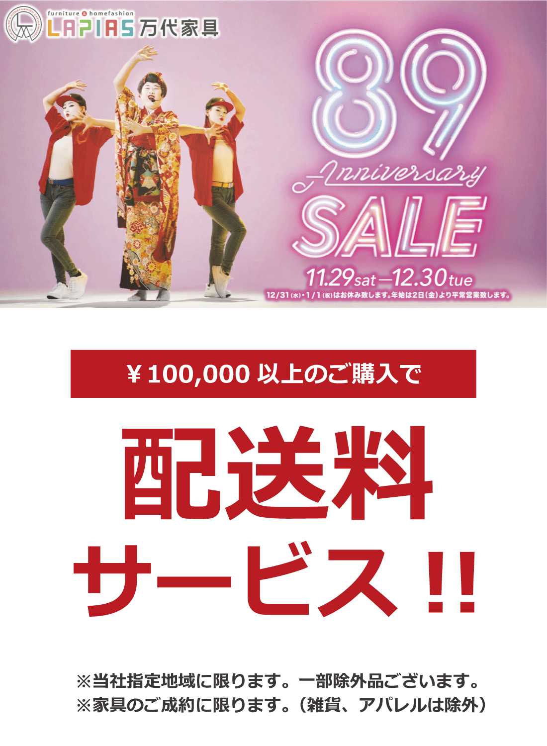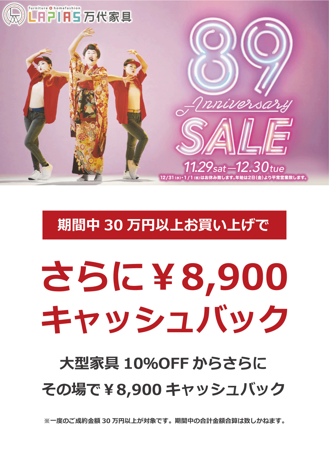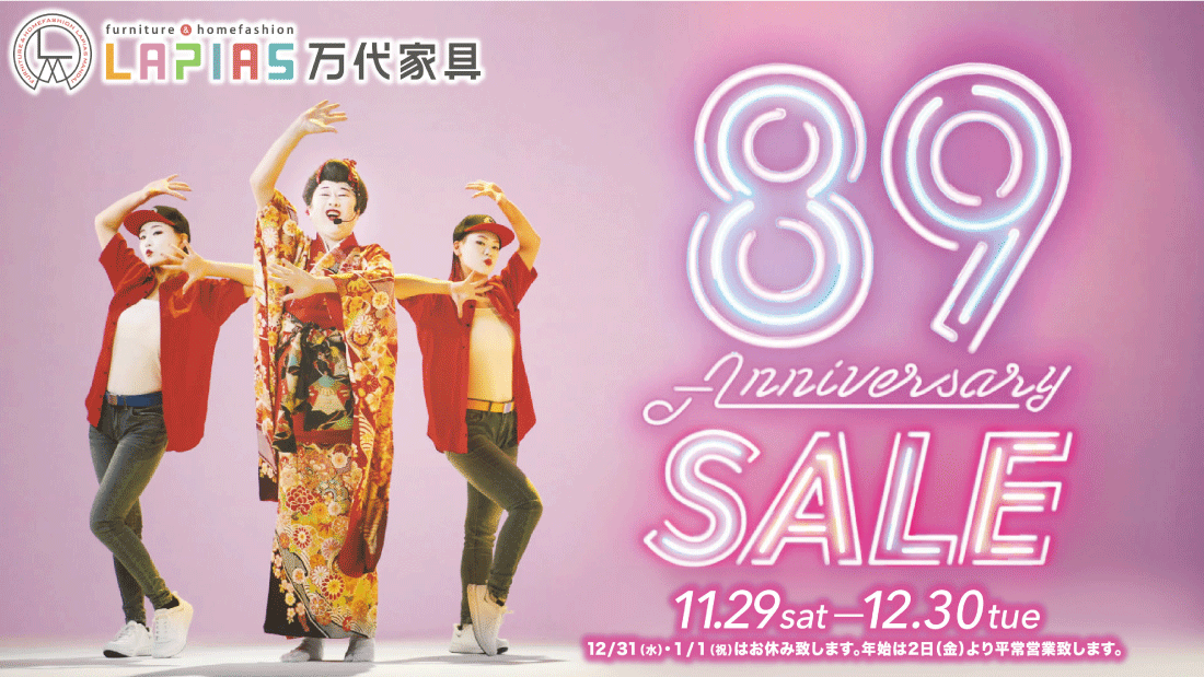 LAPIAS万代家具は、地域の皆様に支えられ、おかげ様で今年で89周年を迎えることができました!!万代家具はホームファッションから高級ブランド家具まで幅広く取り揃えた充実の品揃え。皆様の生活向上のため、新しい暮らしのスタイル&快適な生活をお届けいたします。2025年11月29日(土)よりLAPIAS万代家具3店舗(一宮本店、桑名店、岐阜店)では「89周年アニバーサリーSALE!!」を開催致します。絶対に見逃せないスペシャルイベント!WEB予約限定特典もご用意!是非、お気軽にお申し込みください。