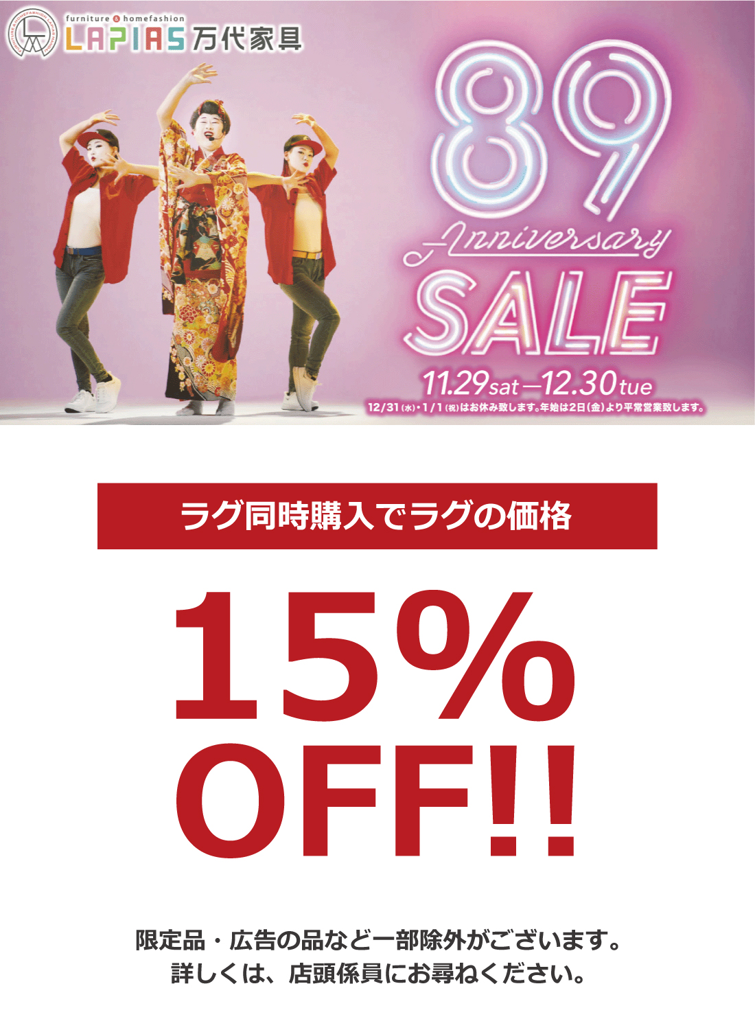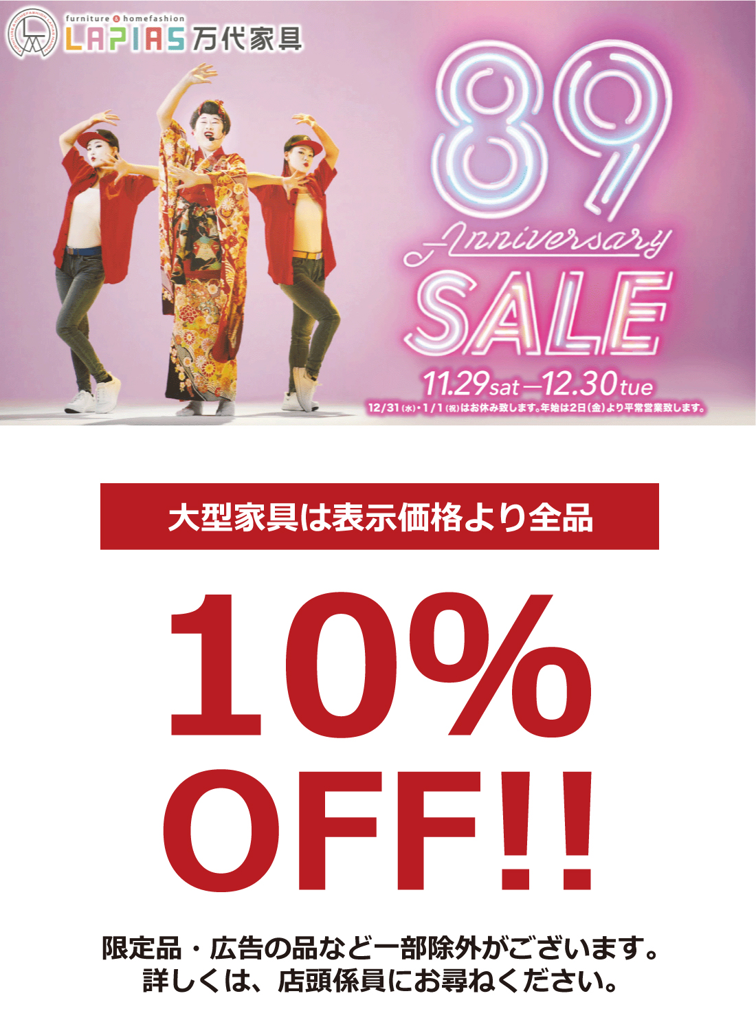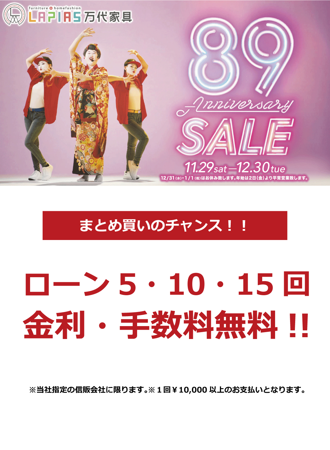 LAPIAS万代家具は、地域の皆様に支えられ、おかげ様で今年で89周年を迎えることができました!!万代家具はホームファッションから高級ブランド家具まで幅広く取り揃えた充実の品揃え。皆様の生活向上のため、新しい暮らしのスタイル&快適な生活をお届けいたします。2025年11月29日(土)よりLAPIAS万代家具3店舗(一宮本店、桑名店、岐阜店)では「89周年アニバーサリーSALE!!」を開催致します。絶対に見逃せないスペシャルイベント!WEB予約限定特典もご用意!是非、お気軽にお申し込みください。