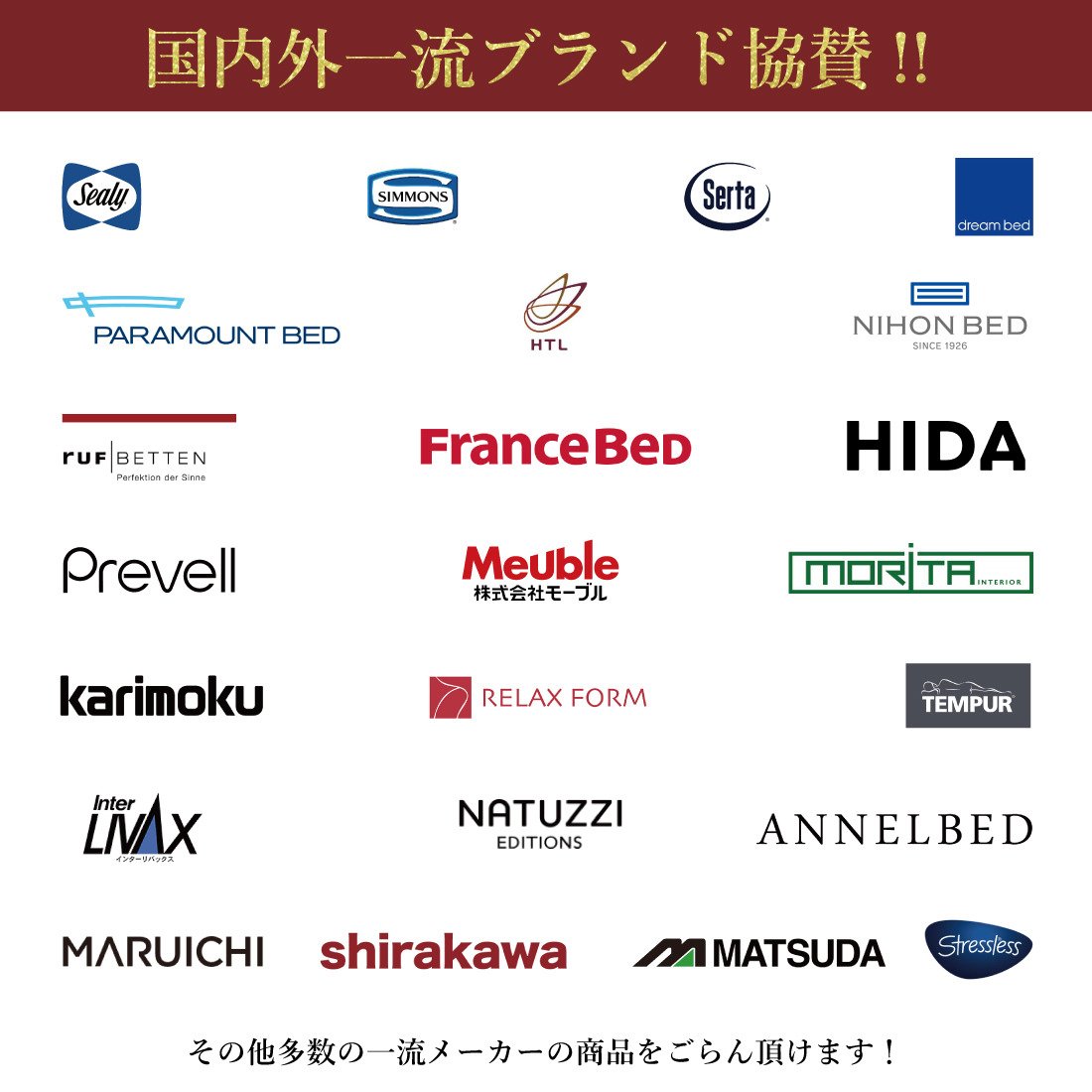 サータ・シモンズ・シーリー・日本ベッド・テンピュール・フランスベッド・アンネルベッド・パラマウントベッド・ルフベッテン・ドリームベッド・ワタリジャパン・馬場家具・フクラ・アヤノ製作所・プレーベル・飛騨産業・モーブル・パモウナ・モリタインテリア・カリモク・松田家具・イバタインテリア・マルイチセーリング・シラカワ・エコーネス・コイズミ・リラックスフォーム・ナツッジエディションズ・マスターウォール・ナツッジイタリア・ストレスレス・その他多数(※都合によりお取り扱いメーカーは変更されることがございます。予めご了承くださいませ。)
