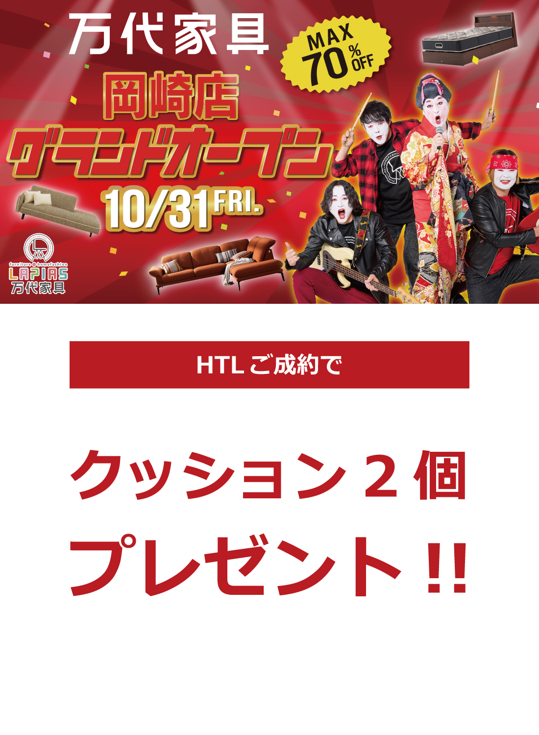 LAPIAS万代家具岡崎店が愛知県岡崎市に万代家具の5店舗目として10月31日(金)グランドオープンいたします!!ホームファッションから高級ブランド家具まで幅広く取り揃えた充実の品揃え。皆様の生活向上のため、新しい暮らしのスタイル&快適な生活をお届けいたします。2025年10月31日(金)よりLAPIAS万代家具 岡崎店では「グランドオープンSALE!!」を開催いたします。絶対に見逃せないスペシャルイベント!WEB予約限定特典もご用意!是非、お気軽にお申し込みください。