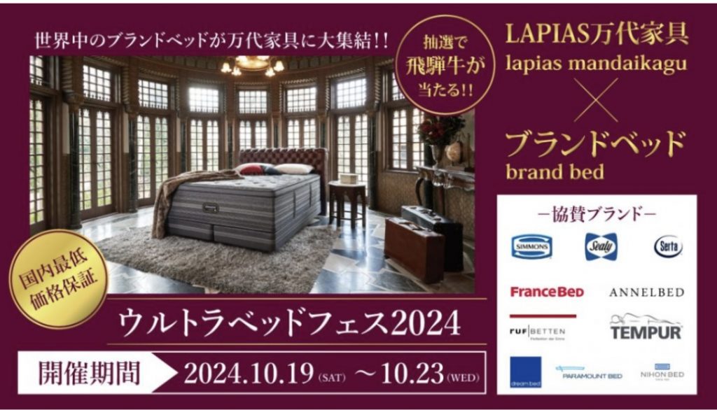 皆様こんにちは! いよいよ年に一度のウルトラベッドフェスが10/19(土)より開催されます! 準備ももう万端なので今から楽しみです! 前回は私のおすすめブランドのテンピュールをご紹介しましたが、(前の投稿はこちら) 本日もウルトラベッドフェスおすすめのブランドをご紹介したいと思います! 「日本ベッド」さんです! 創業は...続きを読む