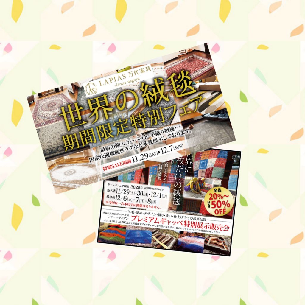 皆様 こんにちは。LAPIAS万代家具ラグ売場です。 この冬、絨毯をお探しの方に+Grace nagoya店・桑名店・岐阜店より特別なお知らせです! まずはこちら! LAPIAS万代家具+Grace nagoya店冬の恒例イベント! 世界の絨毯 期間限定特別フェア を 11/29(土)~12/7(日) ※...続きを読む